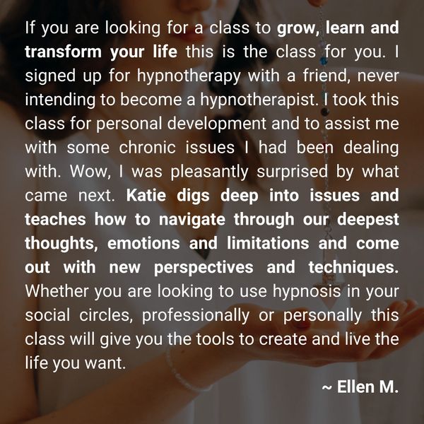 Katie has studied the healing arts for 25+ years and metaphysics for 35+ years. She's an Advanced Hypnotherapist through the N.E. Institution of Ethical Hypnosis and a Certified Master Instructor with the International Association of Counselors and Therapists (IACT).