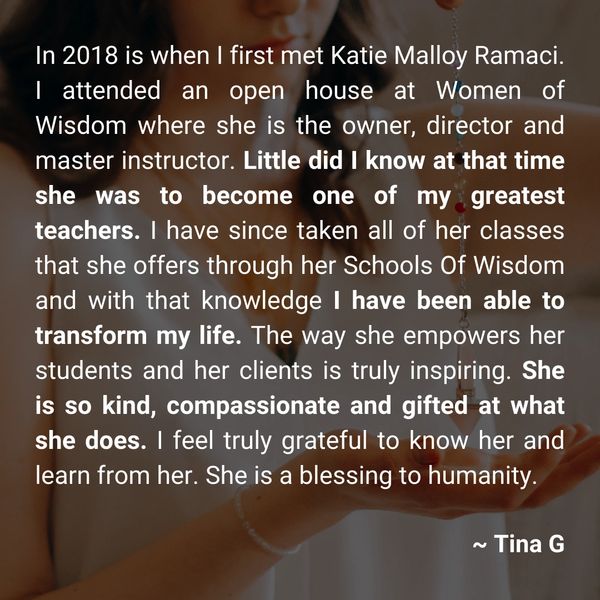 She is experienced in crystal healing, shamanism, kinesiology, Yuen Method, flower essences, etc. She is a Master Teacher/Facilitator of Gaiadon Heart Healing, the Melchizedek Method and other advanced studies for lightworkers. Katie is the Owner, Director, and Master Instructor of Women of Wisdom.